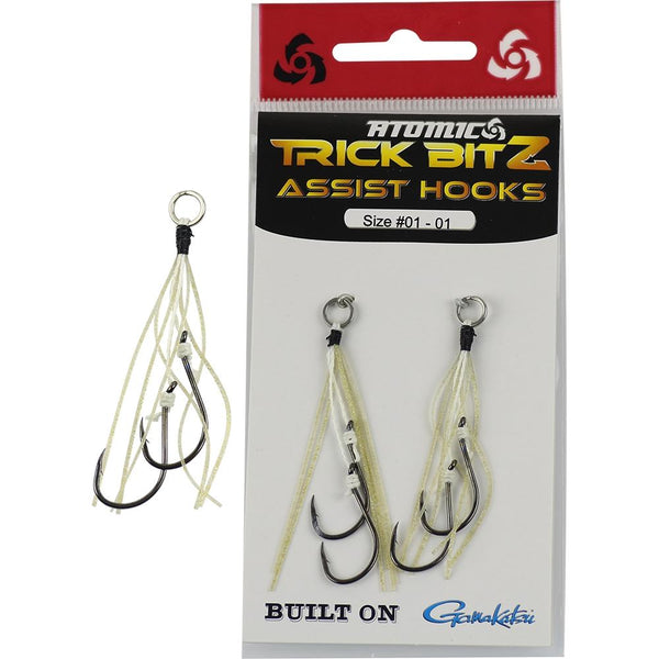 Looking to take your lure to the next level with added appeal and flash,then the Atomic Assist Hooks is what the doctor ordered. The perfect addition to your favourite surface or trolling lure, or almost any lure for that matter, these eye-catching lure additions feature coloured skirts and flash material, and are made using only the finest hardware, including strong, nickel-plated hooks and fail safe ultra secure split rings.