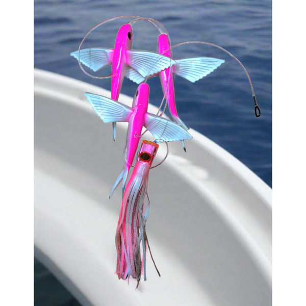 The FatBoy Flying Fish Chain Teaser is the ideal surface splash teaser to troll for all Billfish and Tuna species. Each chain is bench rigged on 300lb mono and features 3x premium FatBoy Flying Fish baits with a 10″ Hard head Rogue lure in chase at the back of the chain, which also adds drag to keep the teaser running true.