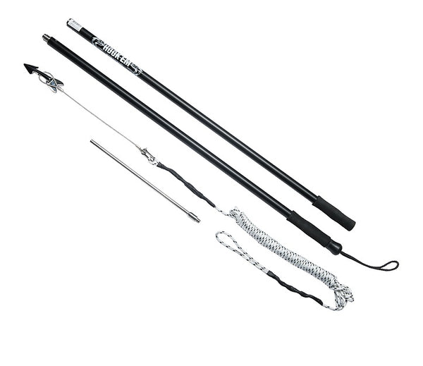 Hook'em Harpoons are available in 2 variations. A 2.0m single piece handle and a 2.0m 2 pice handle. Both are supplied with a lanyard, stainless cast harpoon head and removable shaft, with approx 10m of double braid rope which is attached to a 4mm stainless SWR and hardware that allows quick and easy removal of the harpoon from the fish.