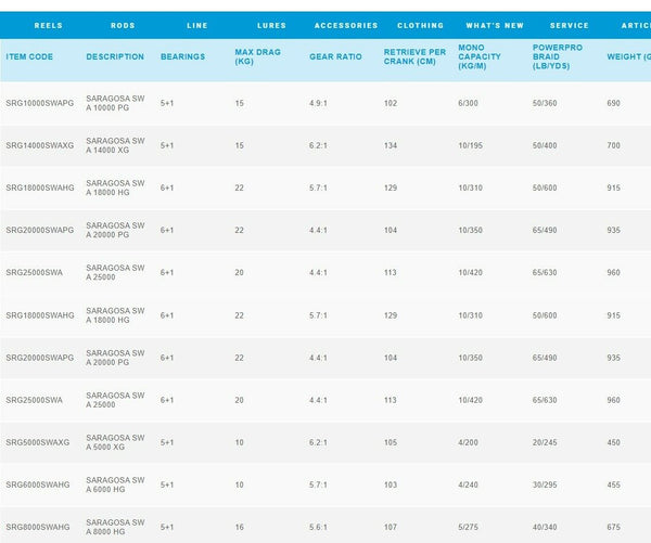 | TEM CODE | BEARINGS | MAX DRAG (KG) | GEAR RATIO | MONO CAPACITY (KG/M) | POWERPRO BRAID (LB/YDS) | WEIGHT (G) |