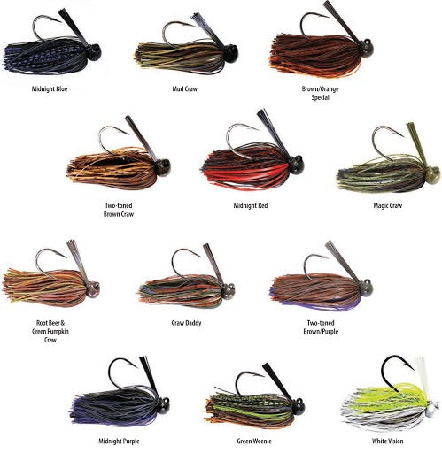 The Dobyns Football Jigs are all hand-tied with custom colored skirts in a combination of round rubber and silicone. The jigs feature Gary’s all time favorite, the Gamakatsu 604 round bend jig hook, that Gary has been using in his own jigs for 20 years. Each jig features the special 4 barb bait keeper to hold the jig trailers in place. These jigs are available in 12 colours, 3/8 oz and 1/2 oz.