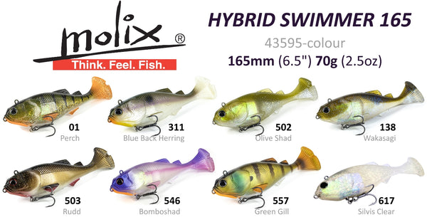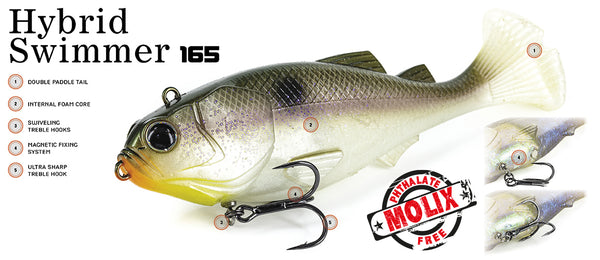 The Hybrid Swimmer 165mm 70g swimbait with a double paddle tail. The swivel treble is held close to the body by a magnet. Internal foam core helps the lure keep a perfect balance under water. 2 tow point options and an upgrades saltwater treble for Australia.