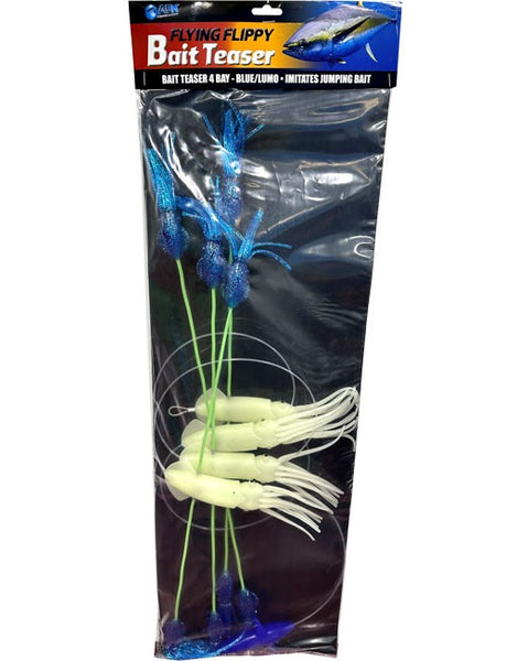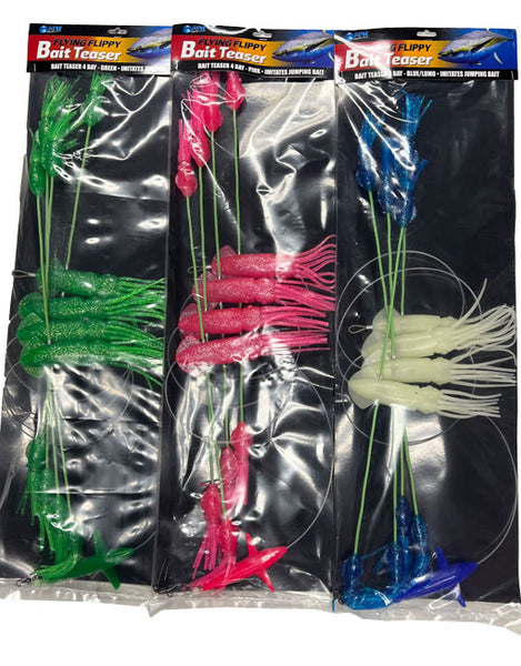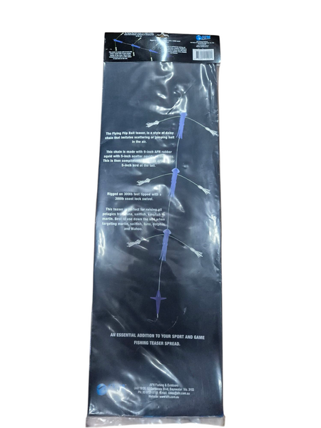The Flying Flip Bait teaser is a style of daisy chain that imitates scattering or jumping bait in the air. This chain is made with 9-inch AFN rubber squid with 5-inch scatter squids on the arms. This is then complimented with an AFN rubber 5-inch bird at the tail. Rigged on 300lb test tipped with a 300lb coast lock swivel. This teaser is perfect for raising all pelagics from tuna, sailfish, kingfish to marlin. Best to use down the slot when targeting marlin, sailfish, tuna, dolphin and Wahoo.