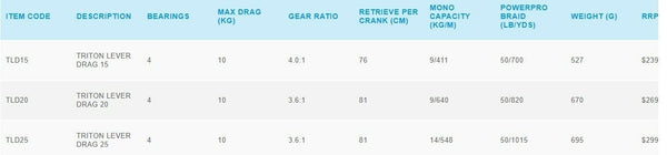 | Size | Bearings | Braid | Drag (Kg) | Ratio | Weight (g) |
